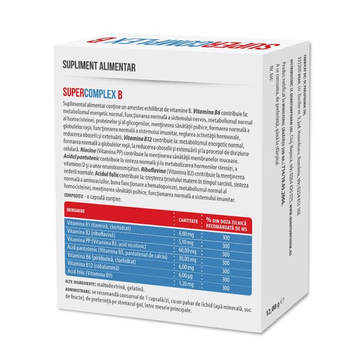 Complexul de vitamine B este esential pentru pastrarea nealterata a functiilor creierului, a presiunii arteriale, asigura productia de energie si neutralizeaza homocisteina din organism. Homocisteina rezulta din procesele metabolice si este un intermediar deosebit de toxic, alterand sistemul cardiovascular. Nivelul sau ridicat este direct asociat cu carenta de vitamine din complexul B. Vitaminele din aceasta clasa sunt solubile in apa, eliminandu-se usor. Organismul uman nu are capacitatea de a le sintetiza, astfel suplimentarea dietei zilnice cu o capsula de SUPER COMPLEX B fiind extrem de utila in mentinerea sanatatii.