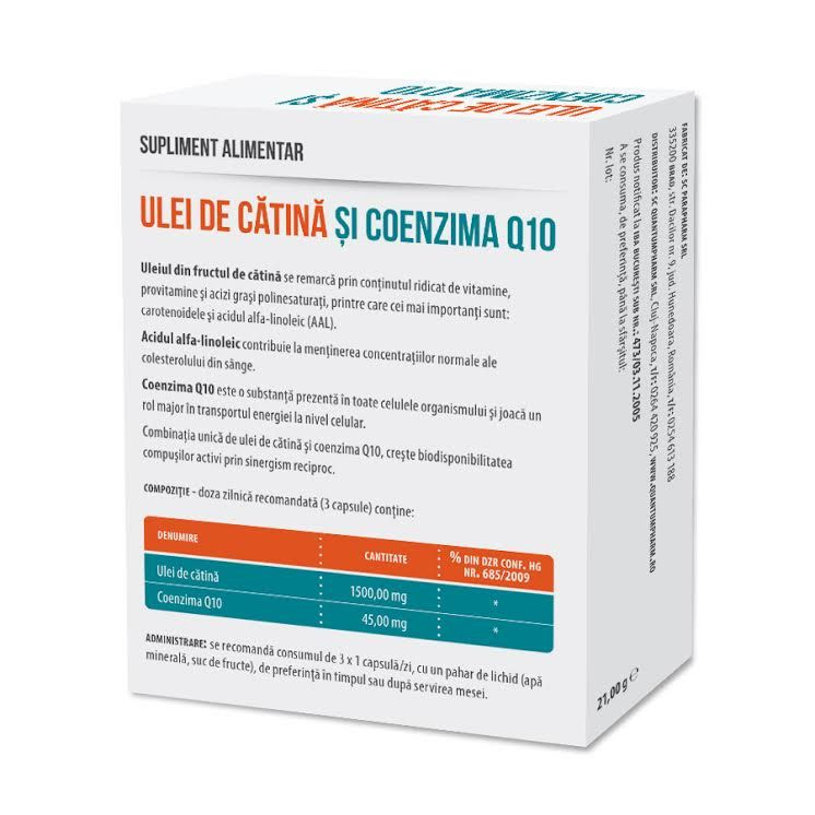 Uleiul obtinut din fructul de catina se remarca prin continutul ridicat de vitamine si provitamine, printre care cei mai importanti sunt carotenoidele. Coenzima Q10 este o substanta prezenta in toate celulele organismului si joaca un rol major in transportul energiei necesare la nivel celular. Este indispensabila desfasurarii normale a proceselor biochimice. Studiile clinice arata ca suplimentarea alimentatiei cu coenzima Q10 creste capacitatea functionala a inimii si reduce considerabil predispozitia la infarct. De asemenea, s-au obtinut rezultate remarcabile in incetinirea procesului de imbatranire si combaterea obezitatii. Combinatia unica de ulei de catina si coenzima Q10, creste biodisponibilitatea compusilor activi prin sinergism reciproc.